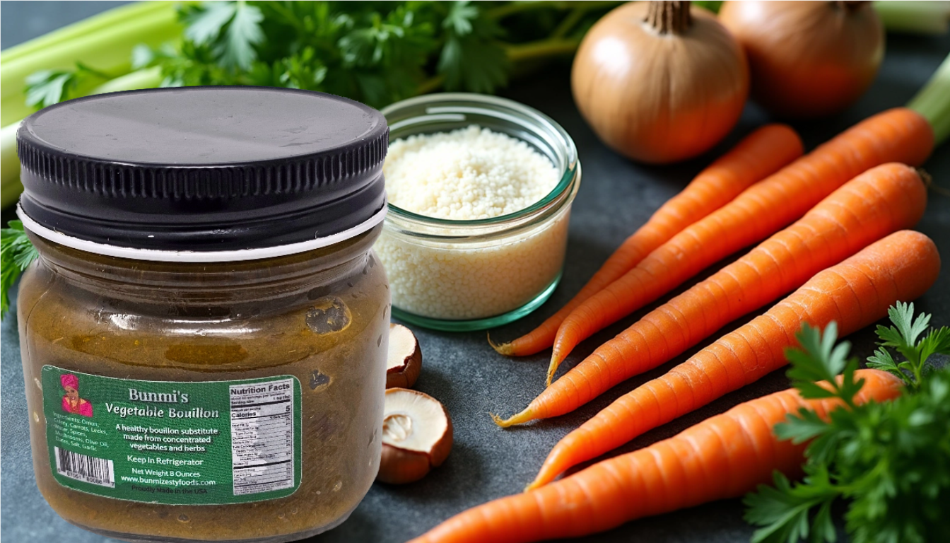 Discover the rich, savory blend of Bunmi's Vegetable Bouillon, expertly crafted to bring both nutrition and exceptional flavor to every dish. Ideal for soups, stews, and more, our bouillon is the perfect choice for health-conscious and vegan diets. At Bunmi Zesty Foods, our commitment to health and taste comes alive in our Vegetable Bouillon.